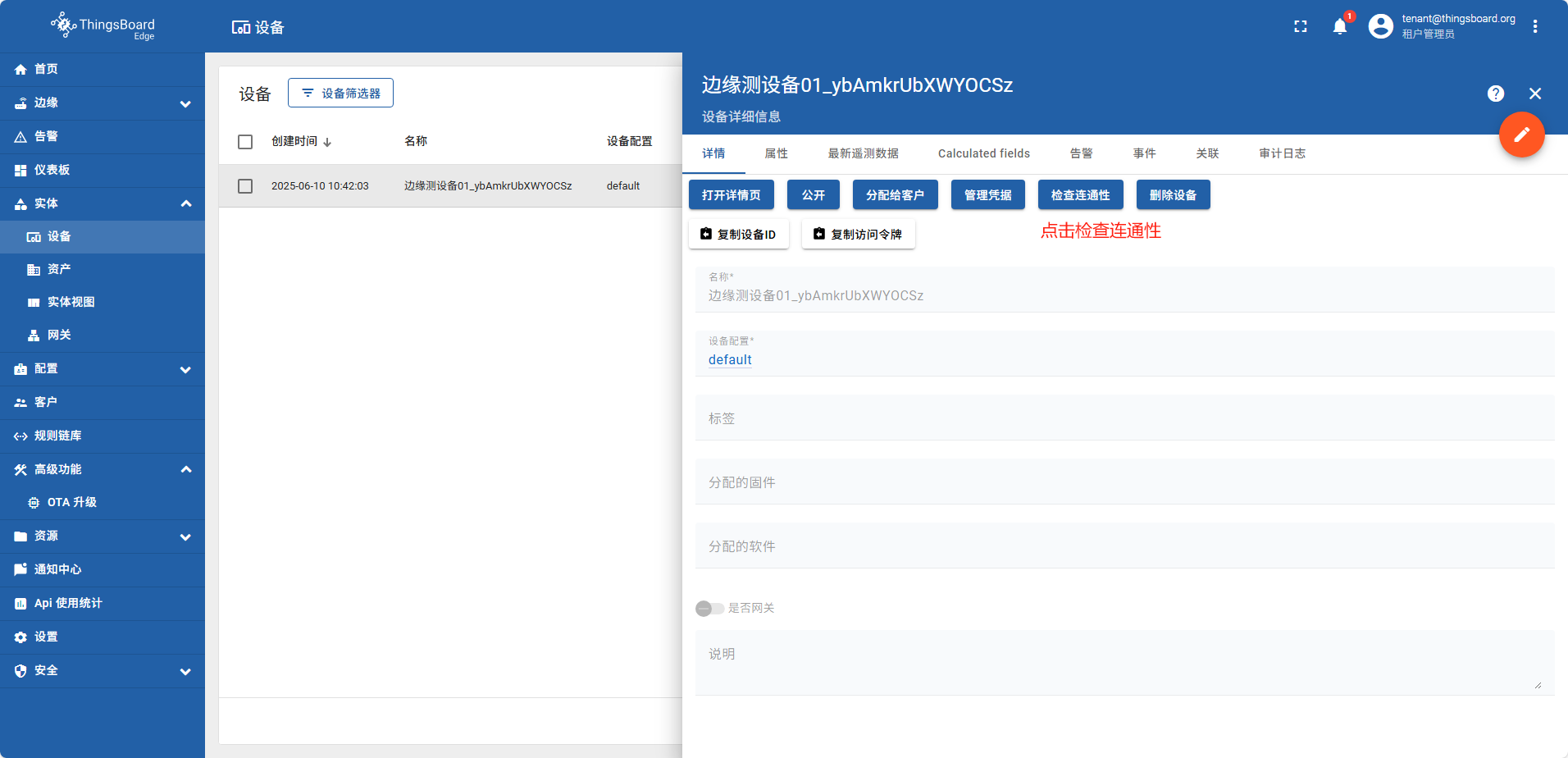 在边缘侧可以创建和云端相同类型的实体(设备、资产、网关),并且他们在边缘侧创建完成后会自动能发布到云端。 以刚创建的 边缘测设备01_ybAmkrUbXWYOCSz 为例