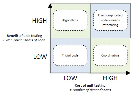在受益于单元测试的好处的同时,也必然增加了代码量以及维护成本(单元测试代码也是要维护的)。下面这张成本/价值象限图很清晰的阐述了在不同性质的系统中单元测试成本和价值之间的关系。