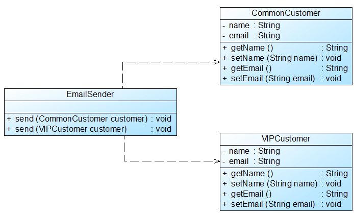 在Sunny软件公司开发的CRM系统中,客户(Customer)可以分为VIP客户(VIPCustomer)和普通客户(CommonCustomer)两类,系统需要提供一个发送Email的功能,原始设计方案如图1所示: