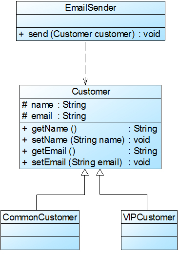 在对系统进行进一步分析后发现,无论是普通客户还是VIP客户,发送邮件的过程都是相同的,也就是说两个send()方法中的代码重复,而且在本系统中还将增加新类型的客户。为了让系统具有更好的扩展性,同时减少代码重复,使用里氏代换原则对其进行重构。