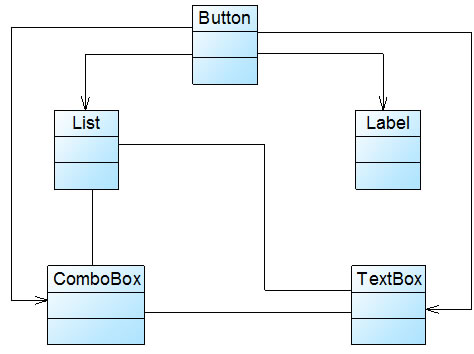 例如,当一个按钮(Button)被单击时,对应的列表框(List)、组合框(ComboBox)、文本框(TextBox)、文本标签(Label)等都将发生改变,在初始设计方案中,界面控件之间的交互关系可简化为如图1所示结构: