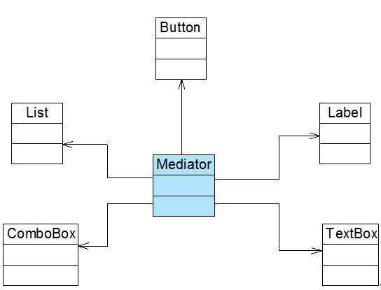 引入中间类之后,界面控件之间不再发生直接引用,而是将请求先转发给中间类,再由中间类来完成对其他控件的调用。