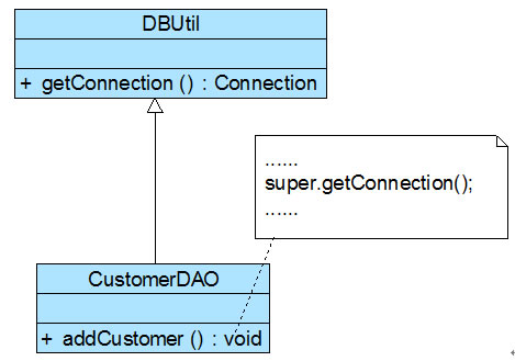 Sunny软件公司开发人员在初期的CRM系统设计中,考虑到客户数量不多,系统采用MySQL作为数据库,与数据库操作有关的类如CustomerDAO类等都需要连接数据库,连接数据库的方法getConnection()封装在DBUtil类中,由于需要重用DBUtil类的getConnection()方法,设计人员将CustomerDAO作为DBUtil类的子类,初始设计方案结构如图1所示: