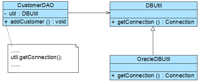 随着客户数量的增加,系统决定升级为Oracle数据库,因此需要增加一个新的OracleDBUtil类来连接Oracle数据库, 由于在初始设计方案中CustomerDAO和DBUtil之间是继承关系,因此在更换数据库连接方式时需要修改CustomerDAO类的源代码,将CustomerDAO作为OracleDBUtil的子类,这将违反开闭原则。 【当然也可以修改DBUtil类的源代码,同样会违反开闭原则。】