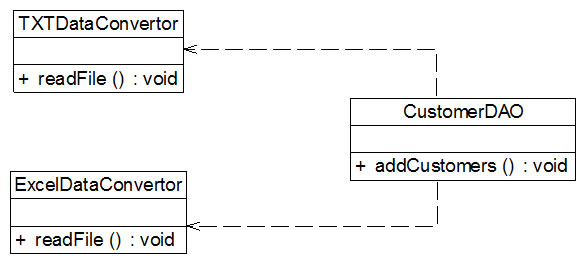 在编码实现图1所示结构时,Sunny软件公司开发人员发现该设计方案存在一个非常严重的问题,由于每次转换数据时数据来源不一定相同,因此需要更换数据转换类,如有时候需要将TXTDataConvertor改为ExcelDataConvertor, 此时,需要修改CustomerDAO的源代码,而且在引入并使用新的数据转换类时也不得不修改CustomerDAO的源代码,系统扩展性较差,违反了开闭原则,现需要对该方案进行重构。