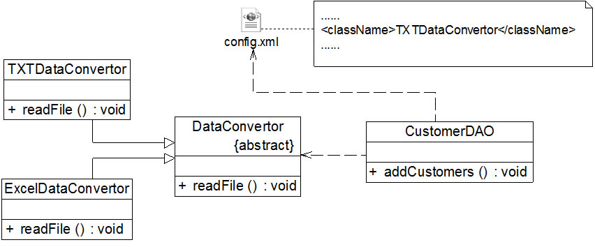 在本实例中,由于CustomerDAO针对具体数据转换类编程,因此在增加新的数据转换类或者更换数据转换类时都不得不修改CustomerDAO的源代码。 我们可以通过引入抽象数据转换类解决该问题,在引入抽象数据转换类DataConvertor之后,CustomerDAO针对抽象类DataConvertor编程,而将具体数据转换类名存储在配置文件中,符合依赖倒转原则。 根据里氏代换原则,程序运行时,具体数据转换类对象将替换DataConvertor类型的对象,程序不会出现任何问题。 更换具体数据转换类时无须修改源代码,只需要修改配置文件;如果需要增加新的具体数据转换类,只要将新增数据转换类作为DataConvertor的子类并修改配置文件即可,原有代码无须做任何修改,满足开闭原则。
