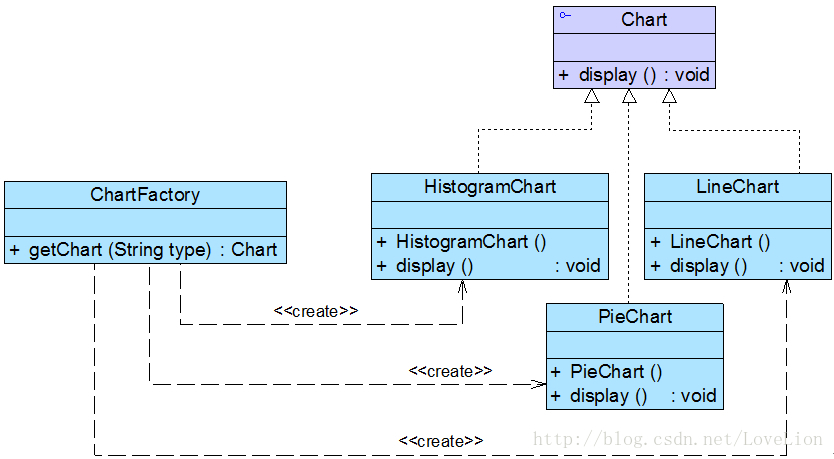 在图2中,Chart接口充当抽象产品类,其子类HistogramChart、PieChart和LineChart充当具体产品类,ChartFactory充当工厂类。完整代码如下所示: