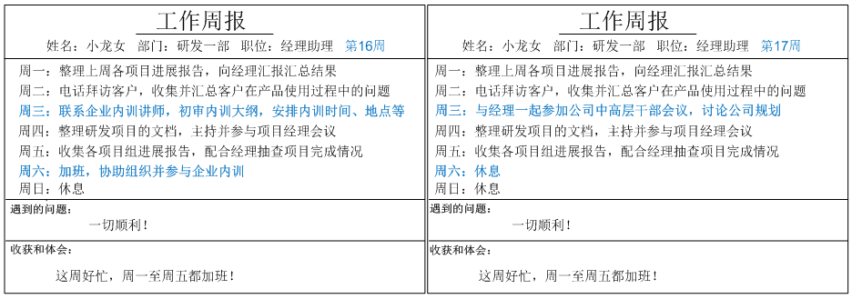 追其原因,Sunny软件公司的OA管理员发现,由于某些岗位每周工作存在重复性,工作周报内容都大同小异,工作周报示意图如下。