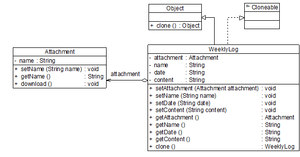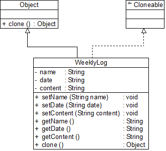 WeeklyLog充当具体原型类,Object类充当抽象原型类,clone()方法为原型方法。WeeklyLog类的代码如下所示:
