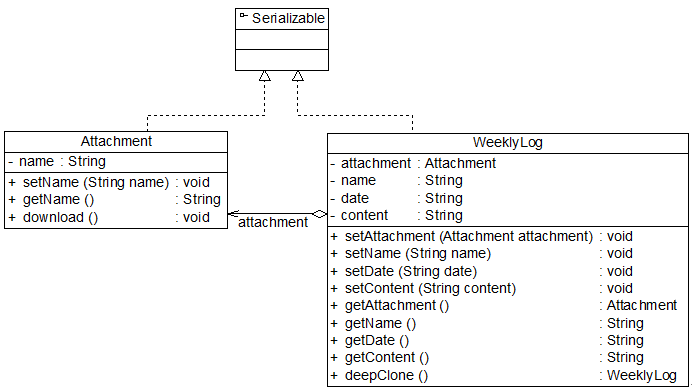 下面我们使用深克隆技术来实现工作周报和附件对象的复制,由于要将附件对象和工作周报对象都写入流中,因此两个类均需要实现Serializable接口,其结构如图: