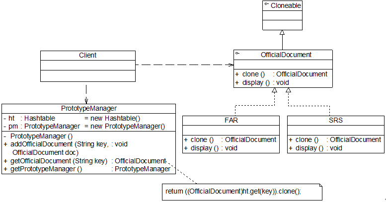 我们使用带原型管理器的原型模式实现公文管理器的设计,其结构如图: