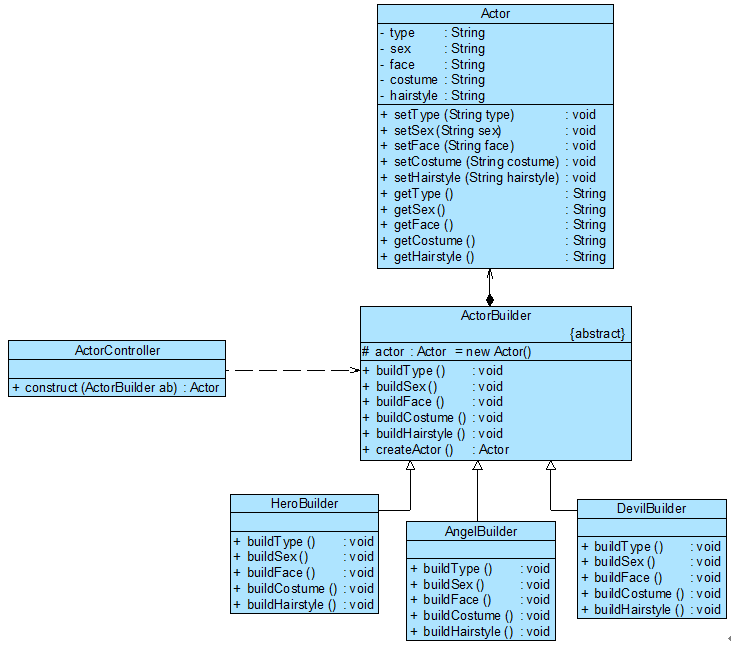 ActorController充当指挥者,ActorBuilder充当抽象建造者,HeroBuilder、AngelBuilder和DevilBuilder充当具体建造者,Actor充当复杂产品。完整代码如下所示: