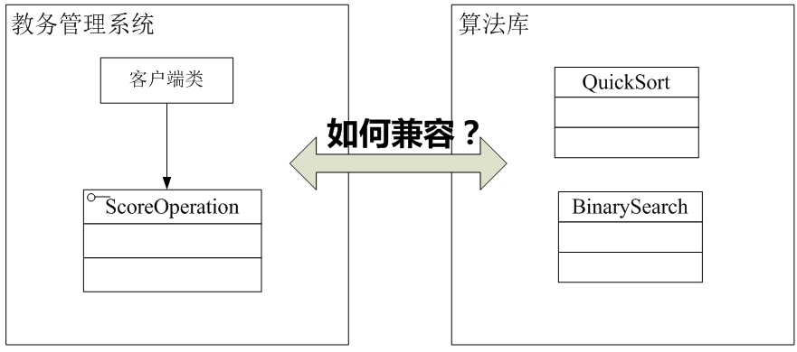 通过分析,我们不难得知,现在Sunny软件公司面对的问题有点类似本章最开始所提到的电压问题,成绩操作接口ScoreOperation好比只支持20V电压的笔记本,而算法库好比220V的家庭用电,这两部分都没有办法再进行修改,而且它们原本是两个完全不相关的结构,如图所示: