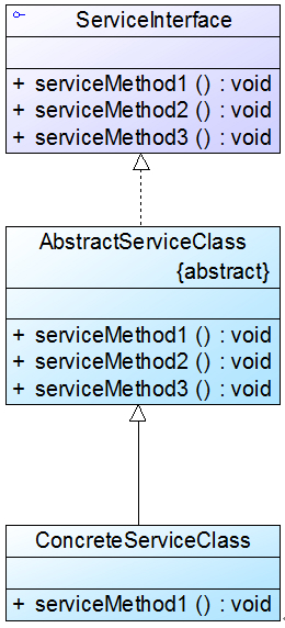 **● AbstractServiceClass(缺省适配器类):**它是缺省适配器模式的核心类,使用空方法的形式实现了在ServiceInterface接口中声明的方法。通常将它定义为抽象类,因为对它进行实例化没有任何意义。