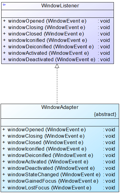 而使用缺省适配器模式就可以很好地解决这一问题,在JDK中提供了一个适配器类WindowAdapter来实现WindowListener接口,该适配器类为接口中的每一个方法都提供了一个空实现,此时事件处理类可以继承WindowAdapter类,而无须再为接口中的每个方法都提供实现。WindowListener和WindowAdapter结构图: