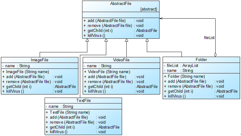 此时,由于在AbstractFile中没有声明add()、remove()等访问和管理成员的方法,其叶子构件子类无须提供实现;而且无论客户端如何定义叶子构件对象都无法调用到这些方法,不需要做任何错误和异常处理,容器构件再根据需要增加访问和管理成员的方法,但这时候也存在一个问题:客户端不得不使用容器类本身来声明容器构件对象,否则无法访问其中新增的add()、remove()等方法,如果客户端一致性地对待叶子和容器,将会导致容器构件的新增对客户端不可见,客户端代码对于容器构件无法再使用抽象构件来定义,客户端代码片段如下所示:
