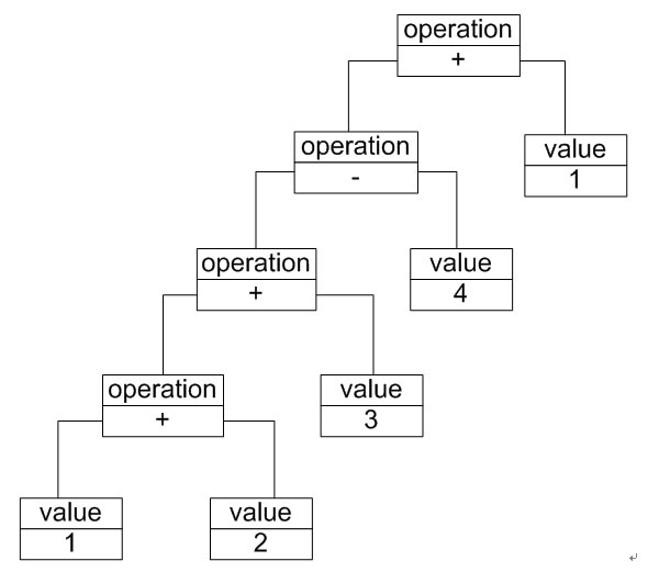 除了使用文法规则来定义一个语言,在解释器模式中还可以通过一种称之为**抽象语法树(Abstract Syntax Tree, AST)**的图形方式来直观地表示语言的构成,每一棵抽象语法树对应一个语言实例,如加法/减法表达式语言中的语句“1+ 2 + 3 – 4 + 1”,可以通过如下图 的抽象语法树表示