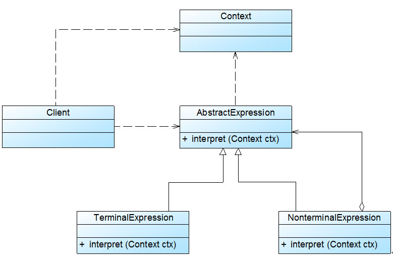 ● Context(环境类):环境类又称为上下文类,它用于存储解释器之外的一些全局信息,通常它临时存储了需要解释的语句。
