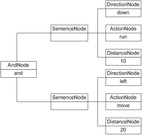 我们可以通过抽象语法树来表示具体解释过程,例如机器人控制指令“down run 10 and left move 20”对应的抽象语法树如图