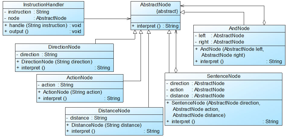 AbstractNode充当抽象表达式角色,DirectionNode、ActionNode和DistanceNode充当终结符表达式角色,AndNode和SentenceNode充当非终结符表达式角色。完整代码如下所示:
