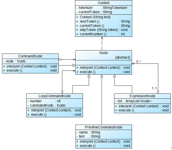 在本实例代码中,环境类Context类似一个工具类,它提供了用于处理指令的方法,如nextToken()、currentToken()、skipToken()等,同时它存储了需要解释的指令并记录了每一次解释的当前标记(Token),而具体的解释过程交给表达式解释器类来处理。我们还可以将各种解释器类包含的公共方法移至环境类中,更好地实现这些方法的重用和扩展。