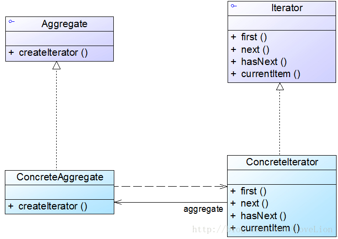 (注:为了简化类图和代码,本结构图中只提供一个具体聚合类和具体迭代器类)