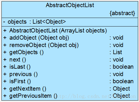 (3) 如果将所有的遍历操作都交给子类来实现,将导致子类代码庞大,而且必须暴露AbstractObjectList的内部存储细节,向子类公开自己的私有属性,否则子类无法实施对数据的遍历,这将破坏AbstractObjectList类的封装性。