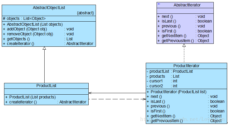 AbstractObjectList充当抽象聚合类,ProductList充当具体聚合类,AbstractIterator充当抽象迭代器,ProductIterator充当具体迭代器。完整代码如下所示: