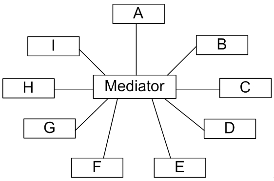 在这个星形结构中,同事对象不再直接与另一个对象联系,它通过中介者对象与另一个对象发生相互作用。中介者对象的存在保证了对象结构上的稳定,也就是说,系统的结构不会因为新对象的引入带来大量的修改工作。