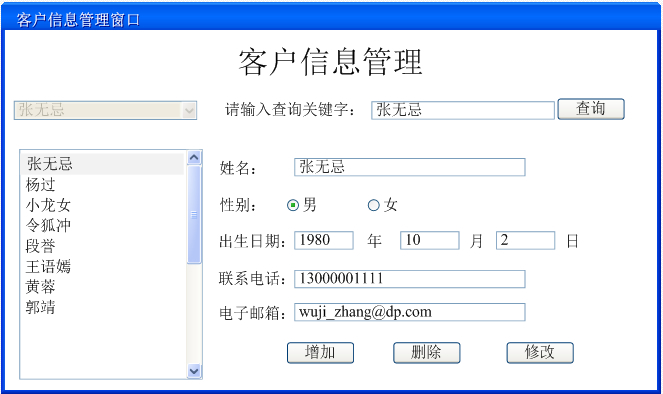 (1) 当用户单击“增加”按钮、“删除”按钮、“修改”按钮或“查询”按钮时,界面左侧的“客户选择组合框”、“客户列表”以及界面中的文本框将产生响应。