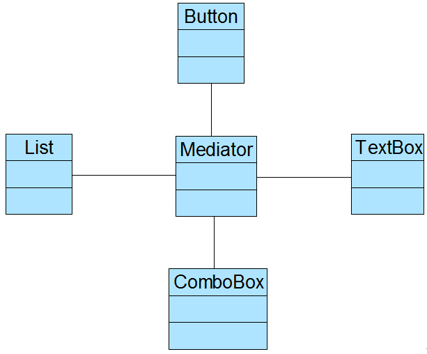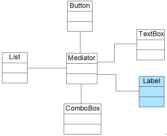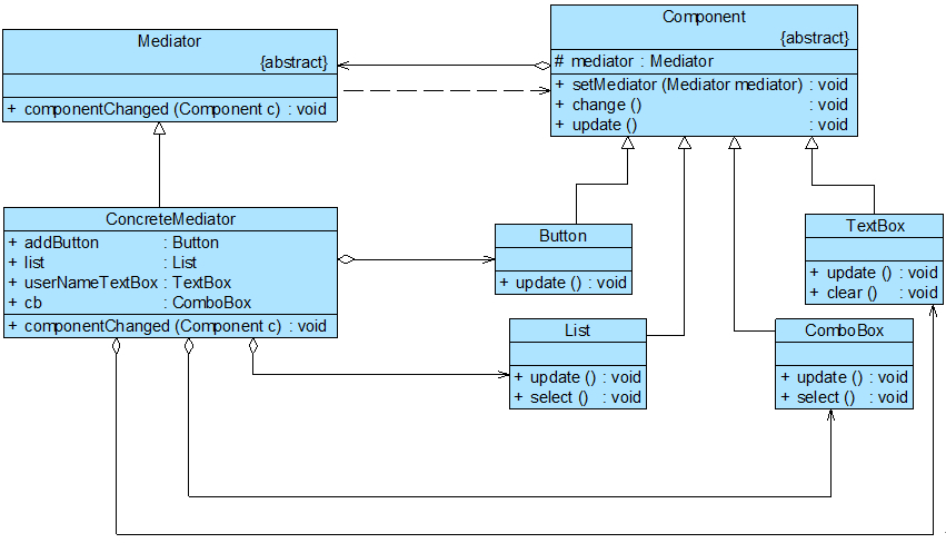 在上图中,Component充当抽象同事类,Button、List、ComboBox和TextBox充当具体同事类,Mediator充当抽象中介者类,ConcreteMediator充当具体中介者类,ConcreteMediator维持了对具体同事类的引用,为了简化ConcreteMediator类的代码,我们在其中只定义了一个Button对象和一个TextBox对象。完整代码如下所示: