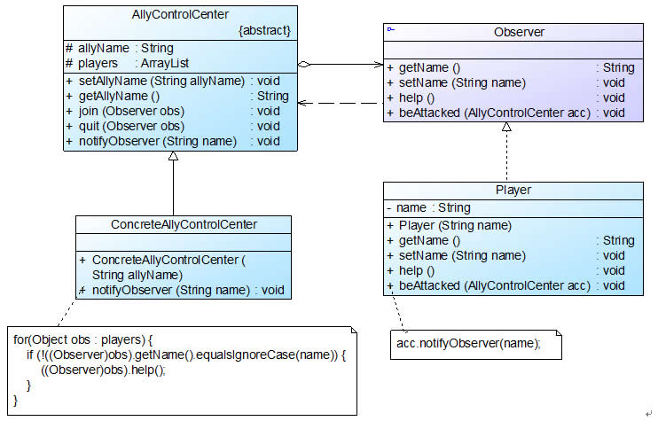 AllyControlCenter充当目标类,ConcreteAllyControlCenter充当具体目标类,Observer充当抽象观察者,Player充当具体观察者。完整代码如下所示: