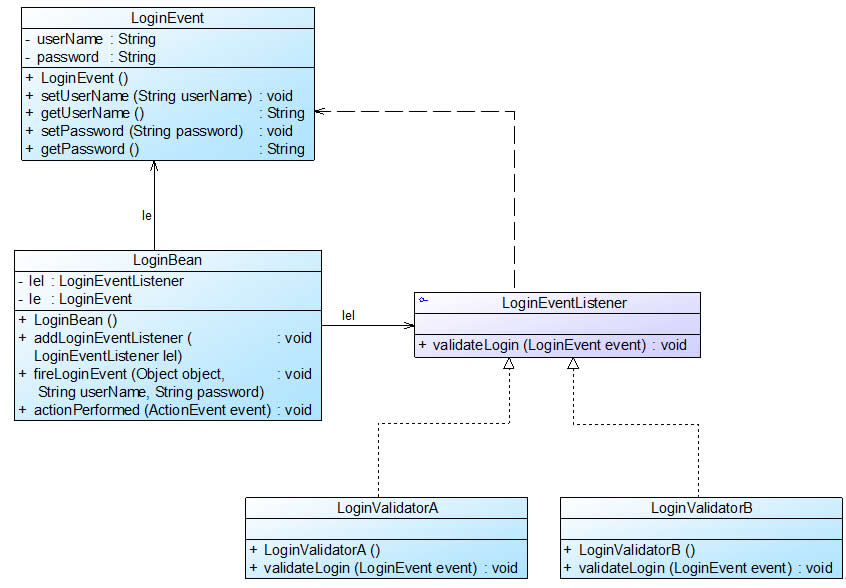 (1) LoginEvent是事件类,它用于封装与事件有关的信息,它不是观察者模式的一部分,但是它可以在目标对象和观察者对象之间传递数据,在AWT事件模型中,所有的自定义事件类都是java.util.EventObject的子类。