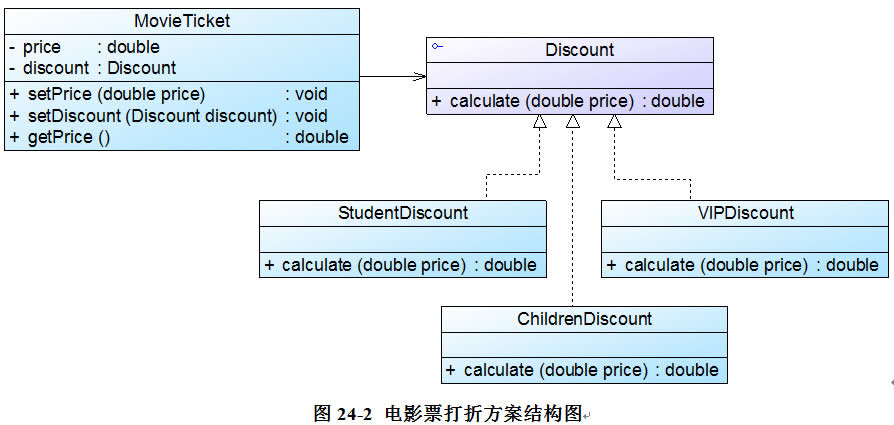 为了实现打折算法的复用,并能够灵活地向系统中增加新的打折方式,Sunny软件公司开发人员使用策略模式对电影院打折方案进行重构,重构后基本结构如图24-2所示: