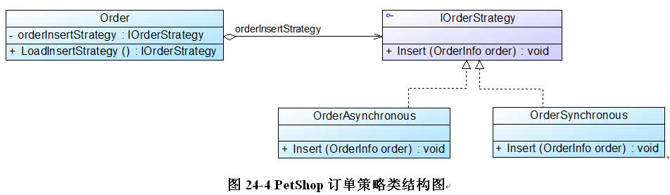 在微软公司提供的演示项目PetShop 4.0中就使用策略模式来处理同步订单和异步订单的问题。在PetShop 4.0的BLL(Business Logic Layer,业务逻辑层)子项目中有一个OrderAsynchronous类和一个OrderSynchronous类,它们都继承自IOrderStrategy接口,如图: